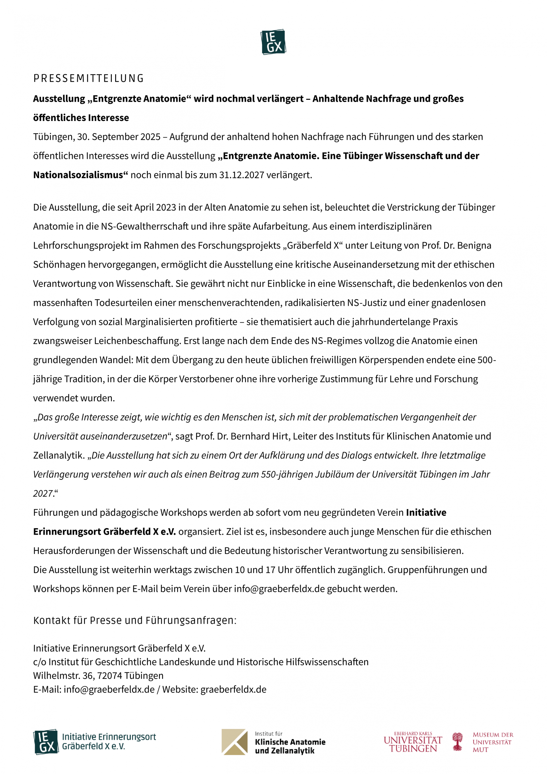 Die Ausstellung „Entgrenzte Anatomie. Eine Tübinger Wissenschaft und der Nationalsozialismus“ wurde ein letztes Mal verlängert – bis zum Uni-Jubiläum 2027. Sämtliche Informationen finden Sie unter dem Reiter Ausstellung.