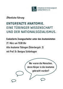 Am 27. März um 15:00 Uhr bietet Benigna Schönhagen eine öffentliche Führung an, in der sie den Fokus auf die exekutierten Zwangsarbeiter unter den Anatomietoten legt.